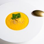 Ir štai, pristatau jums Veg4U sukurtą, išmedituotą moliūgų sriubą, kvepiančią kokosų pienu. Daugiau daržovių jokių nedėjau – jokių bulvių (na kam to papildomo krakmolo), jokių morkų ar papildomo sultinio.